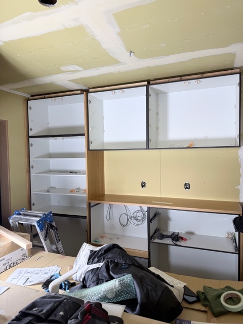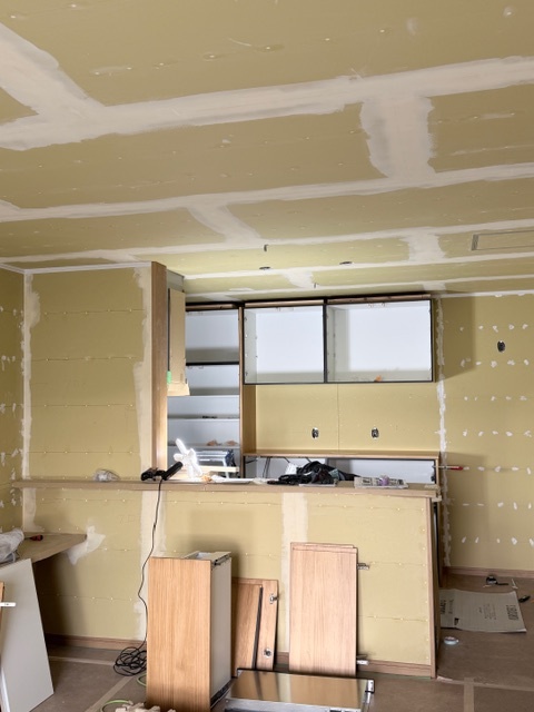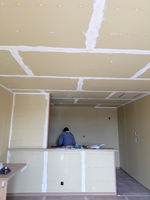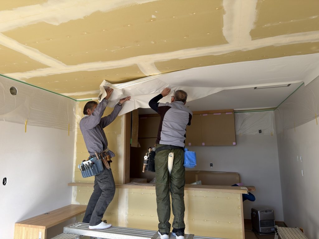 天井のクロス貼り作業状況です。珪藻土クロスで施工が難しいので二人で貼っています。