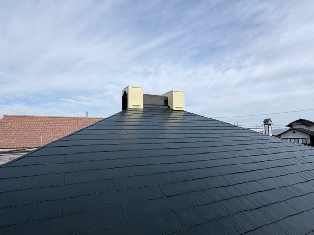 棟飾りを塗装し屋根塗替えの完了となりました。艶が甦り綺麗に仕上がりました。