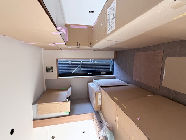 捨て張りの上にフロアー合板を張り養生を行いました。