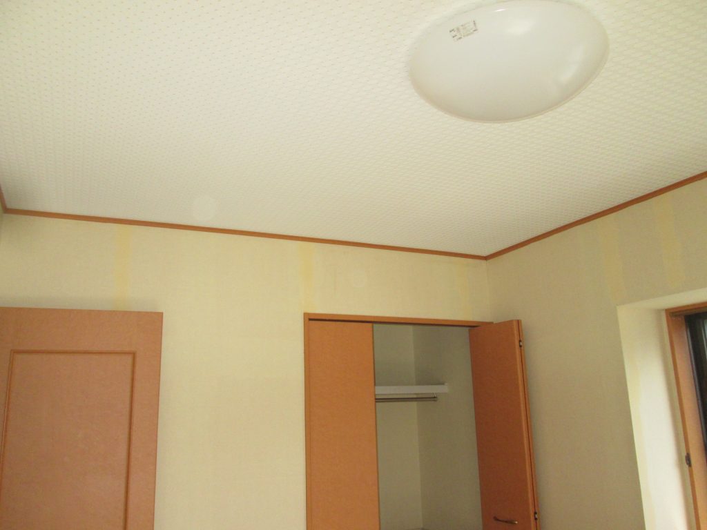 2階の洋間もクロスを貼替えます。下地調整後、天井クロスを貼替えました。