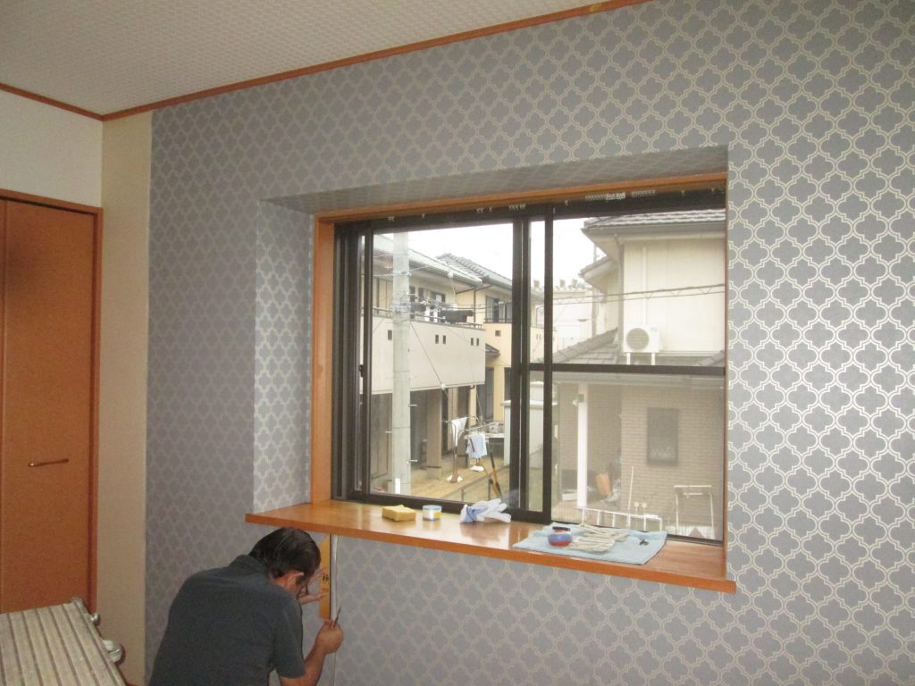 洋室のクロス貼りが進められています。柄物は貼るのに手間がかかります。