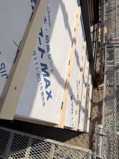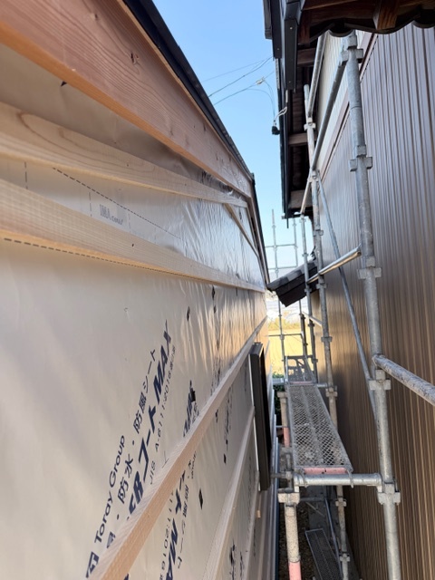 防水シートの上に横胴縁を取り付けました。南面のみサイディングを張るので通気胴縁としています。