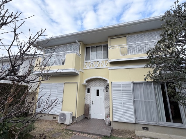 塗替え工事が完了しました。グリーの屋根と黄色の外壁からポップで明るい印象を受けます。綺麗になったお宅で新年を迎えることが出来お喜びいただきました。(工事範囲:屋根・外壁塗替え)