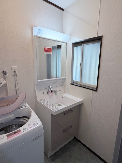 洗面化粧台の側面に不燃化粧板(セラール)を貼り、汚れ防止としました。