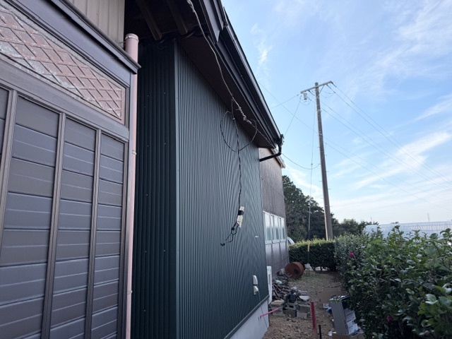 外部足場が撤去されました。濃いグリーンの外壁が落ち着いた雰囲気です。