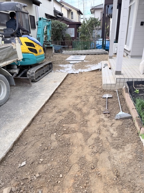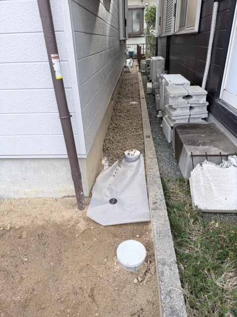 外構工事作業状況です。防草シートを張り砂利を敷き詰めます。