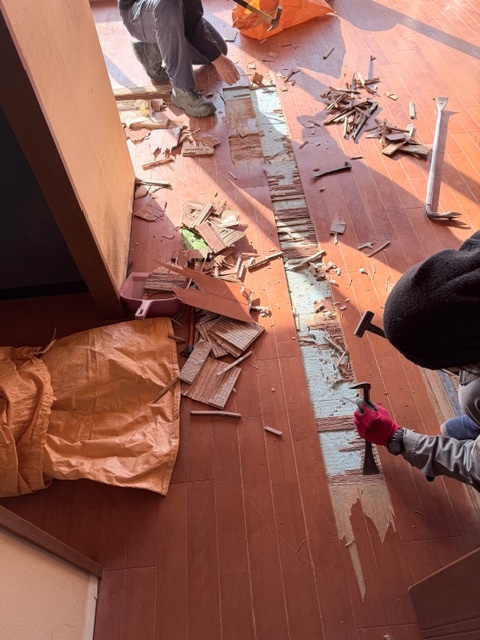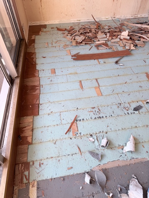 マンションの各部屋をリフォームします。リビングの床を剥がしています。