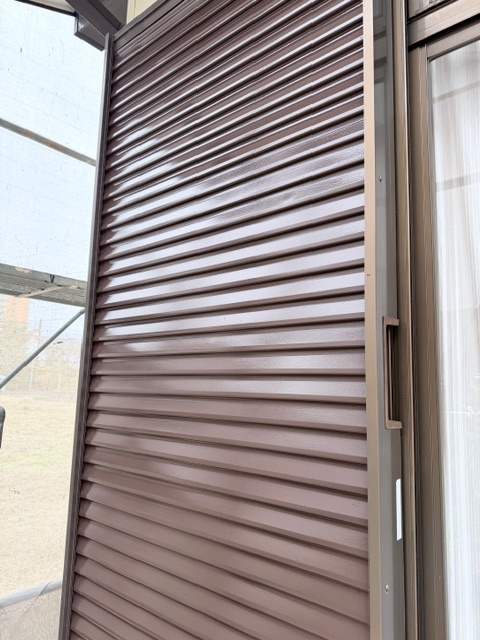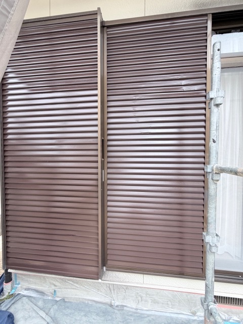 雨戸の上塗りが完了しています。ブラウン色で綺麗に仕上がりました。
