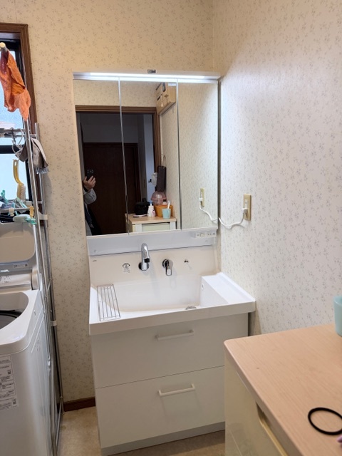 トイレには手摺を設け使い勝手を考慮しています。洗面化粧台も取替え、収納と使い易さをアップさせました。(工事範囲:トイレ・洗面リフォーム)