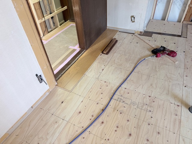 捨て張りの上にフロアー合板を張って行きます。