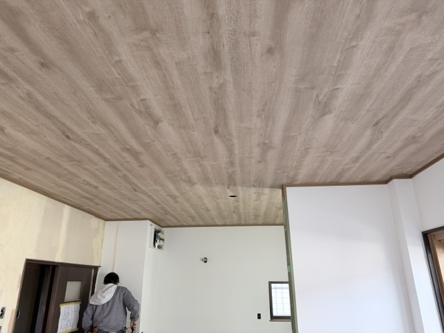 天井、壁の順でクロスを貼って行きます。