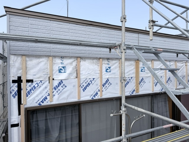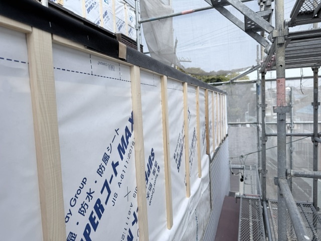 防水シートを張り、サイディング下地を取り付けました。