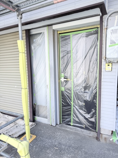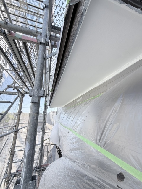 開口部の養生を行い霧除けの軒天を上塗りしました。