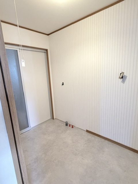 洗面所のクロス貼りが完了しています。床はクッションフロアーで仕上げています。