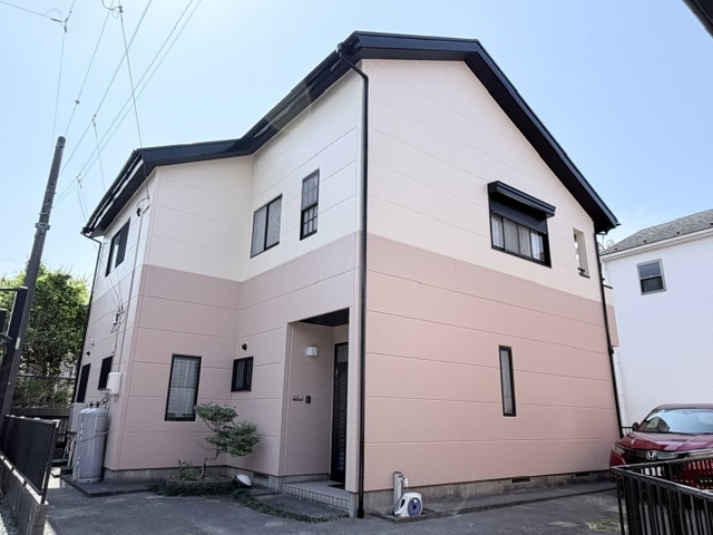 塗替え工事が完了しました。淡いピンク色で温かさの感じられる外観になりました。