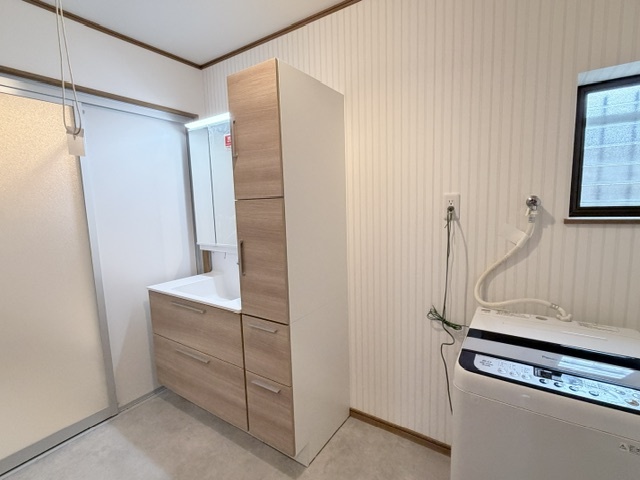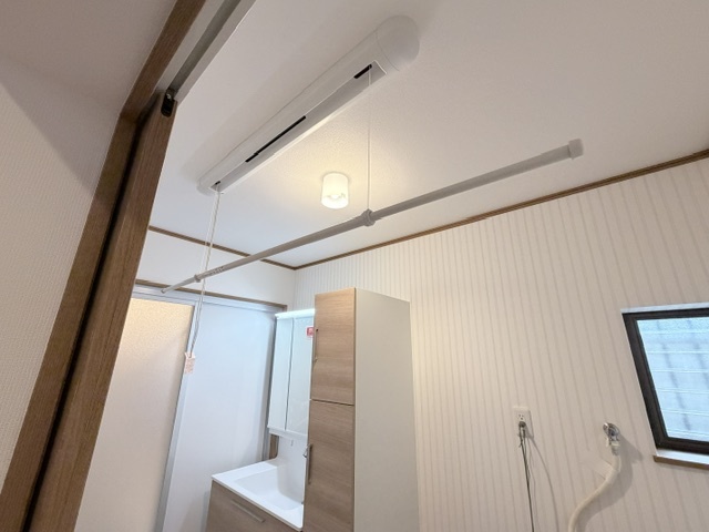 浴室を造り替えることで洗面所のスペースを広げることが出来ました。洗面化粧台を大型に、収納もタップリ行えます。天井には収納式の物干しを取り付けました。