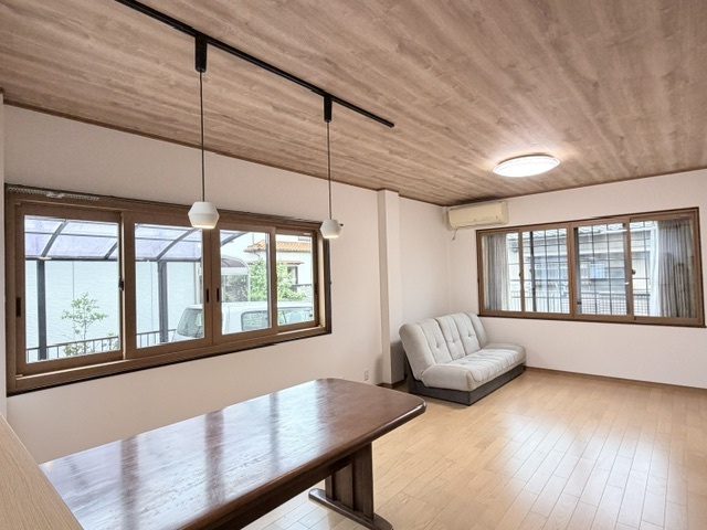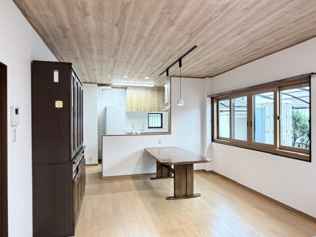 LDKは、間仕切りを無くし天井を木目とした事で、空間の広がりが感じられます。