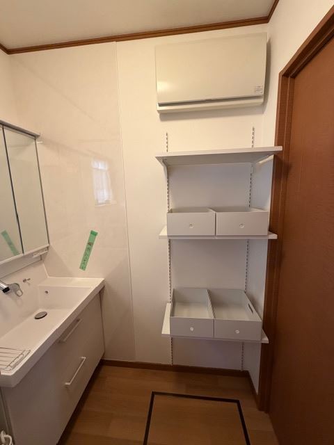 洗面所リフォーム完了です。化粧台の側面に汚れ防止用の不燃化粧パネルを貼りました。空きスペースには可動棚を取り付け収納を確保しています。(工事範囲:洗面所リフォーム)