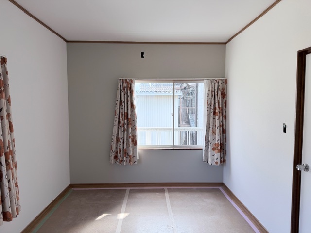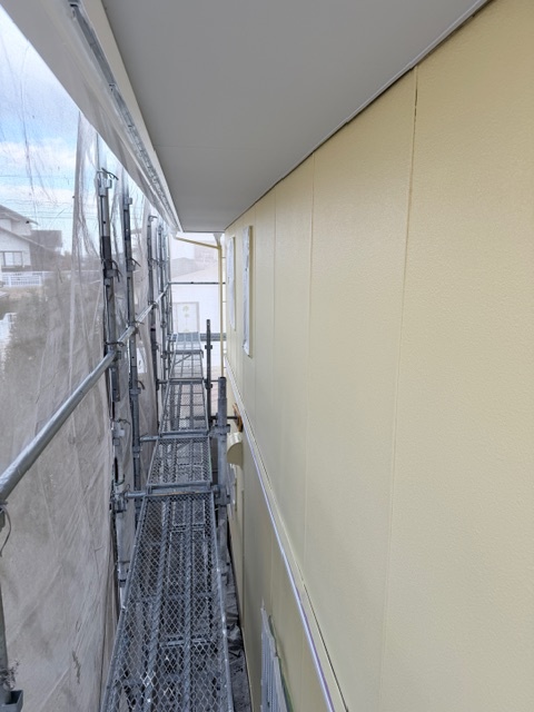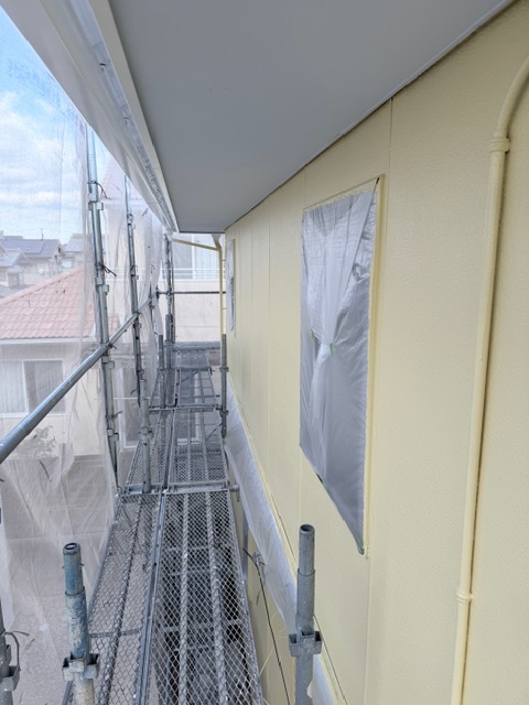 サッシを塗料で汚さないようビニールシートで養生しました。軒天は、ホワイトで明るく仕上げています。