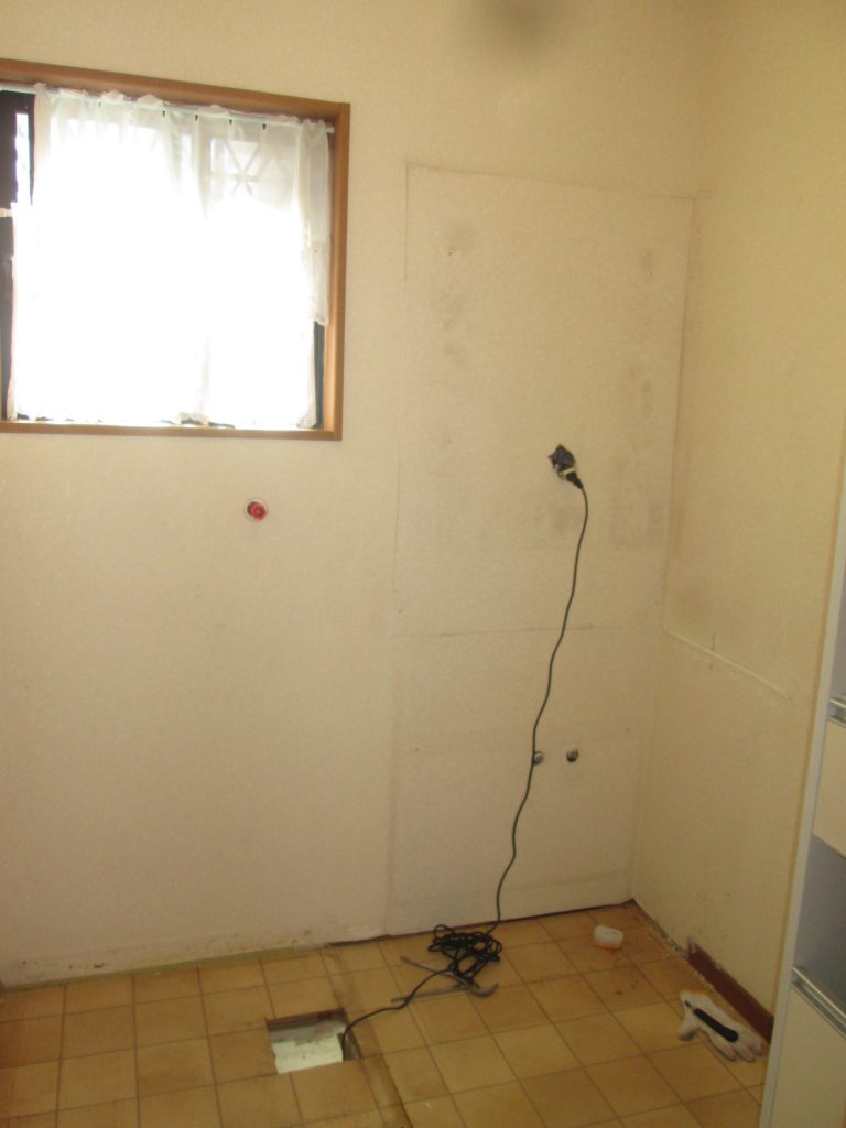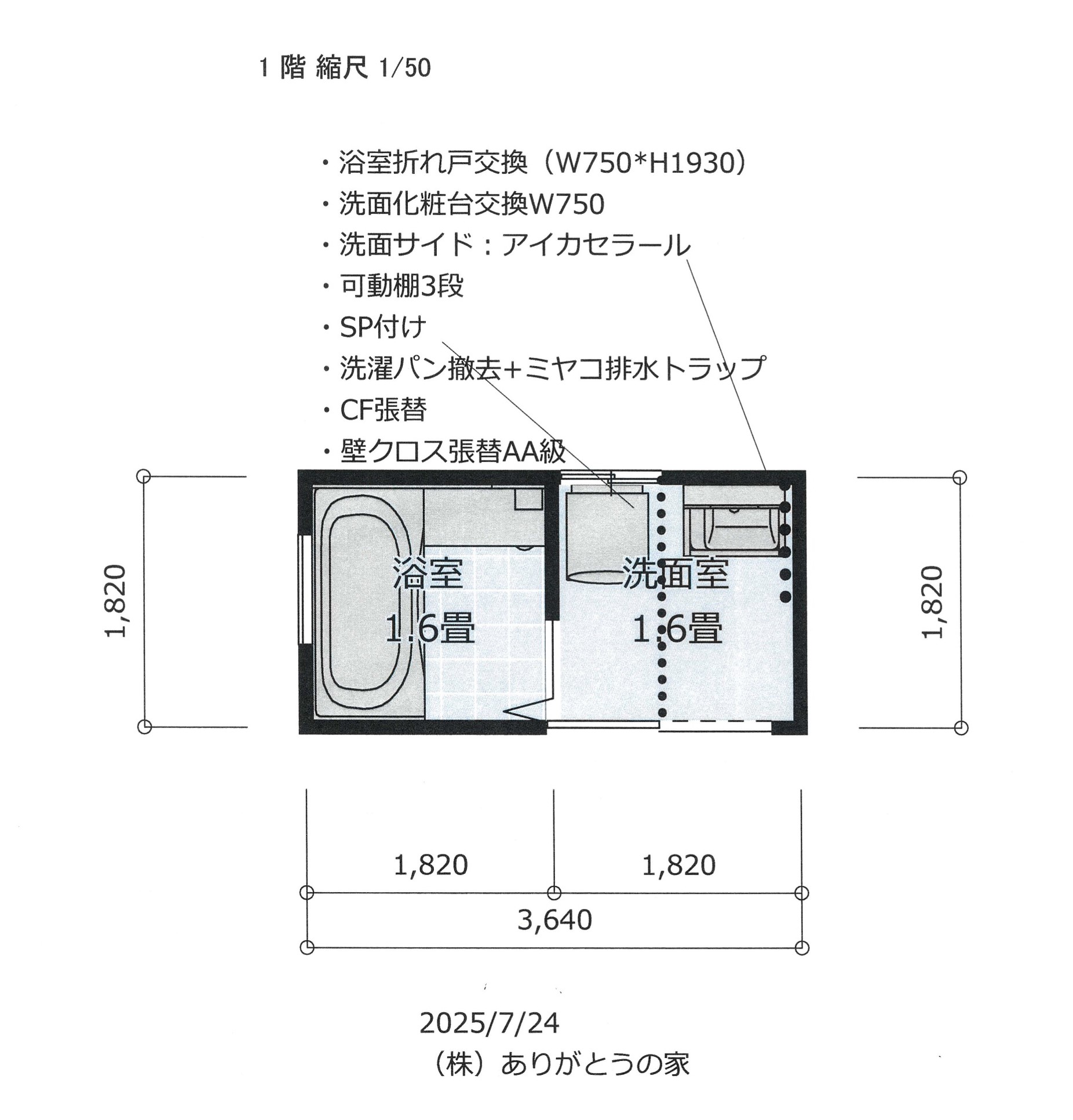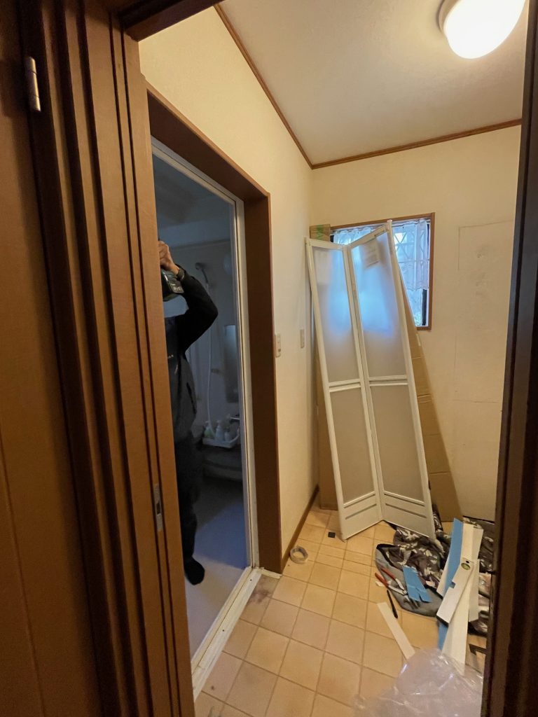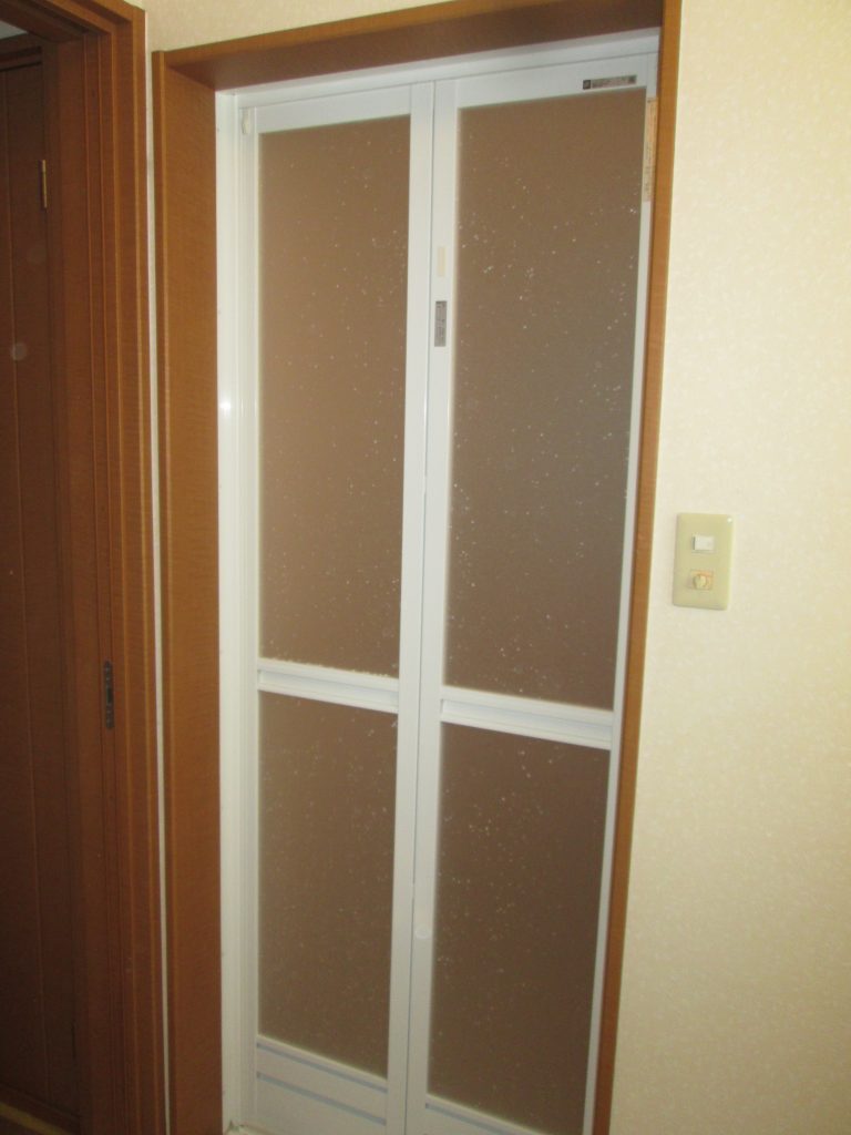 お風呂のドアをリフォーム用ドアに取替えました。また洗面も交換し、クッションフロアと壁クロスも交換しました。
