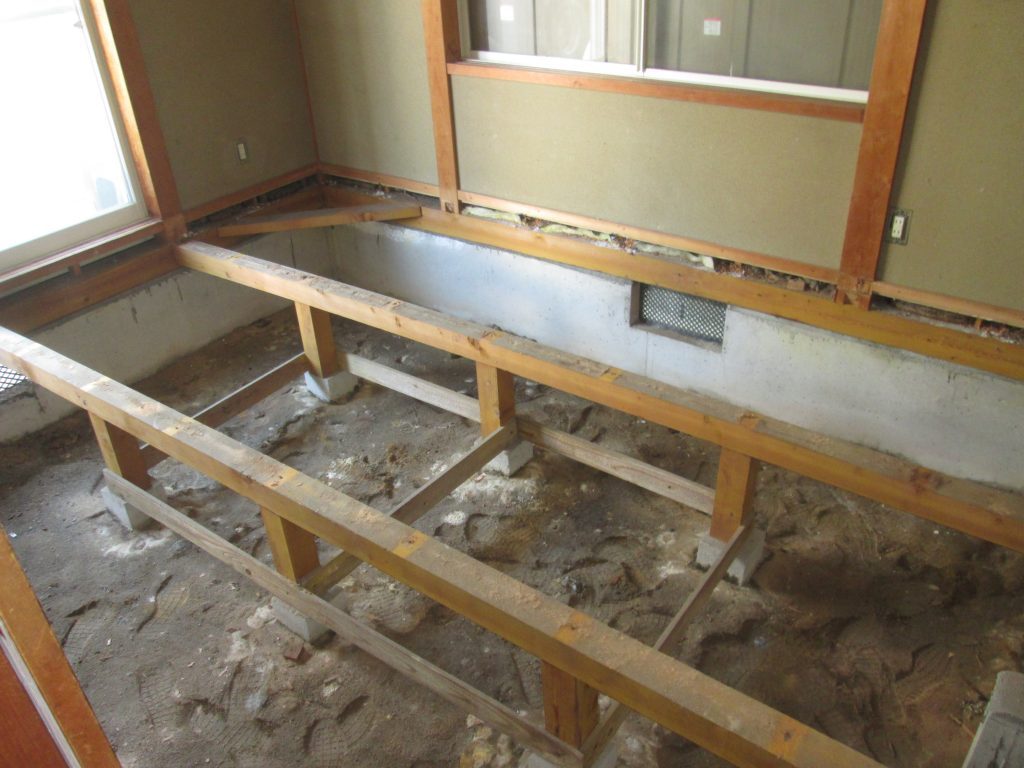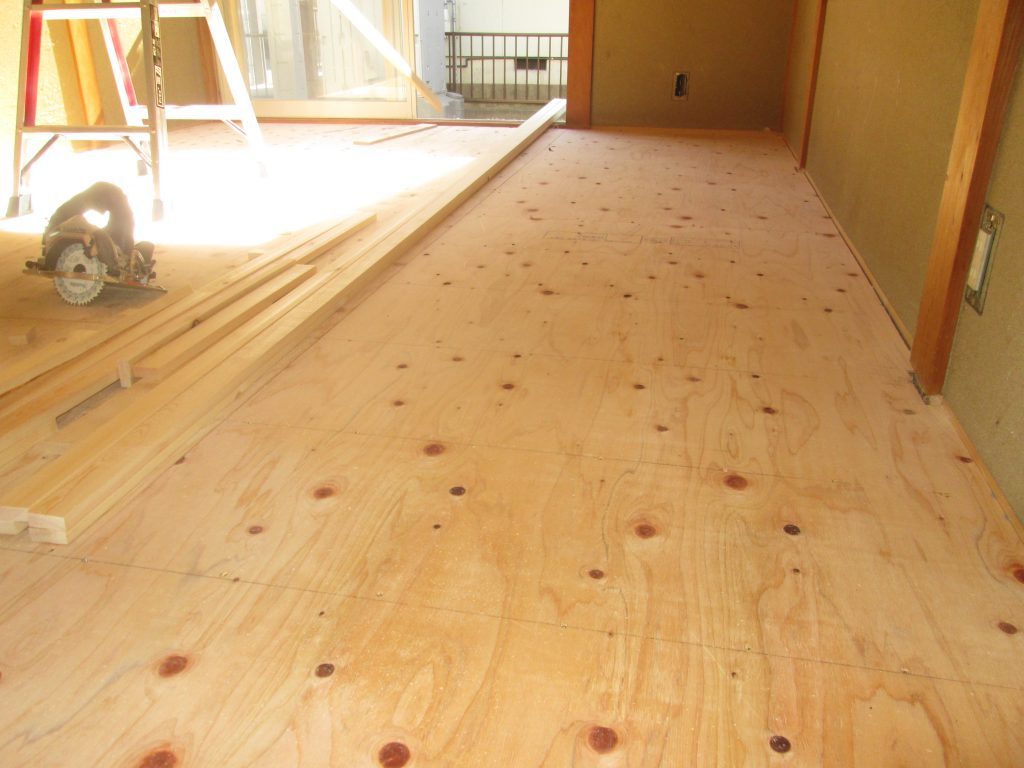 和室の床を張りました。嵩上げした根太に断熱材+捨て貼りを行いました。