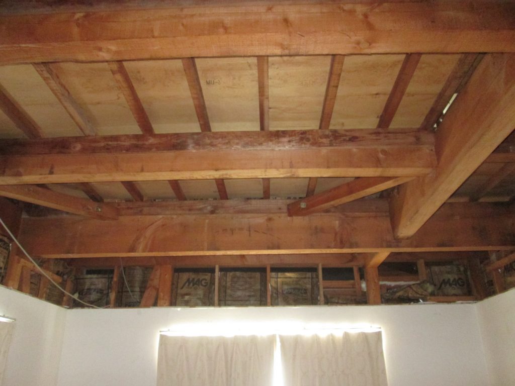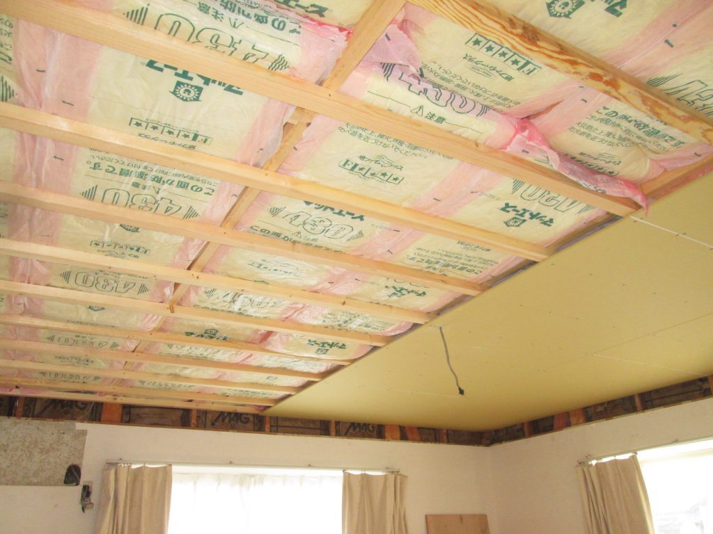 リビングの掘り込み天井を解体してフラットに造り変えます。グラスウールを充填しボードを張りました。