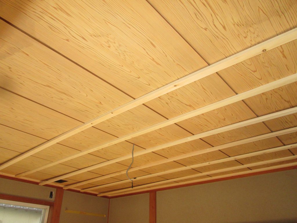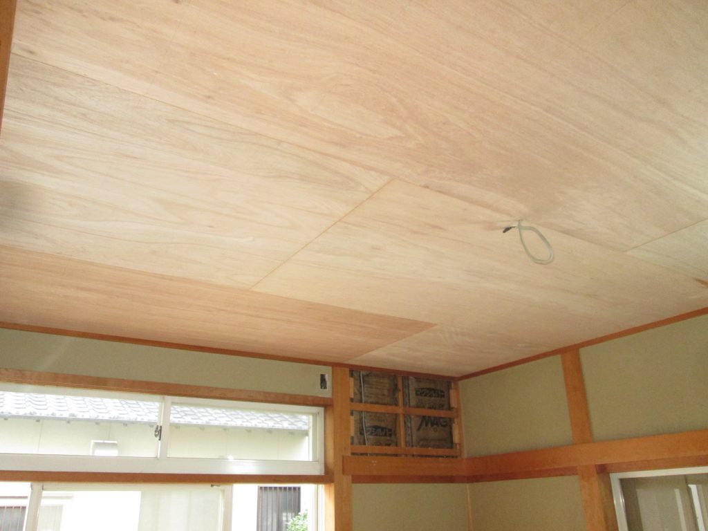 和室の天井をクロス仕上げにする為のベニヤを張っていきます。