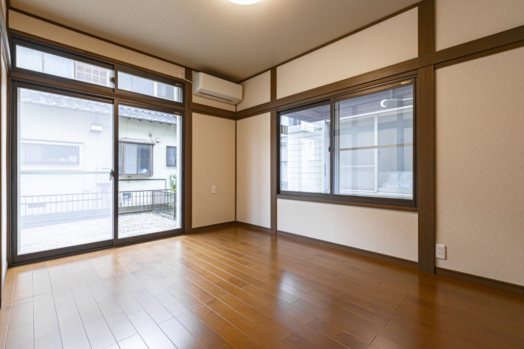和室は長押や柱はそのままにし、濃いブラウン色で塗装しました。フローリングを張り、床の間をクロークに改修し古民家風の素敵な空間に生まれ変わりました。