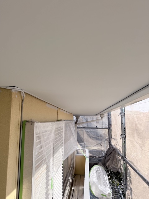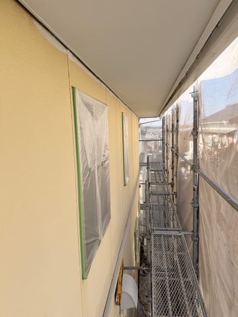 サッシを塗料で汚さないようビニールシートで養生しました。軒天は、ホワイトで明るく仕上げています。