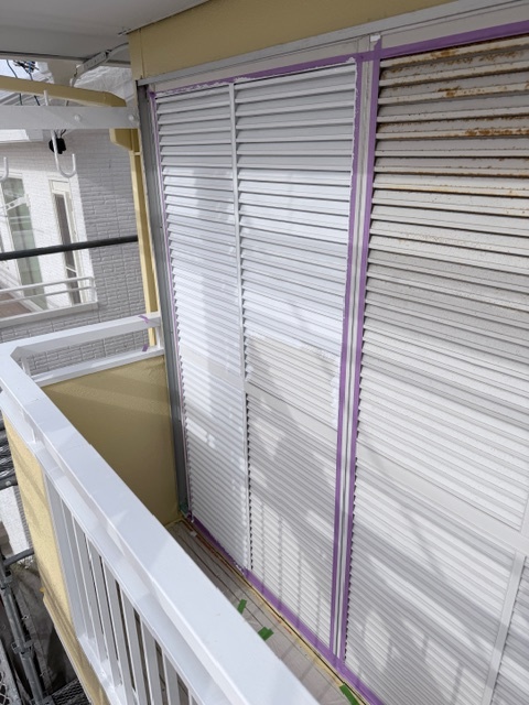 雨戸の上塗りを行っています。
