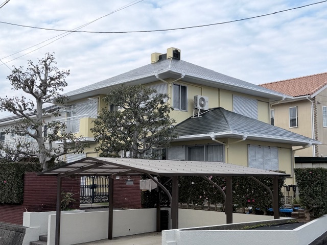 屋根の仕上がり状況です。下塗り+アクリルシリコン樹脂系塗料を2回塗り重ねて仕上げました。