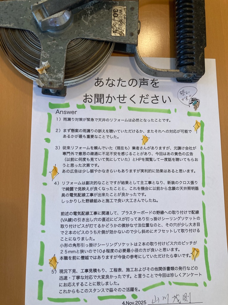 1)雨漏り対策が緊急で天井のリフォームは必然となったことです。 2)まず懸案の雨漏りの訴えを聴いていただけるかまたそれへの対応が可能であるかが最も重要なことでした。 3)従来リフォームを頼んでいた業者さんがありますが、元請会社が専門外で意思の疎通に不安を感じることがあり、今回はあの黄色の広告とHPを閲覧して一度話を聴いてもらおうと思った次第です。 4)リフォームは副次的なことですが結果として主工事となり、新装のクロス張りで綺麗で見栄えが良くなったことと、これを機会に以前から念願の天井照明器具の電気配線工事ができたことがよかったです。しっかりした野縁組と施工で良い大工さんでしたね。 5)現状下見、工事見積、工程表、施工およびその他関係書類などの迅速・丁寧な対応で大変良かったです。ということで今回は珍しくアンケートにお答えすとことにいたしました。これからもこのスタンスで益々のご活躍を。